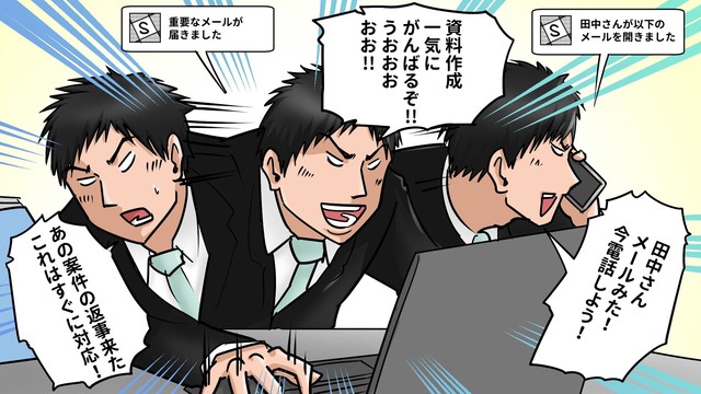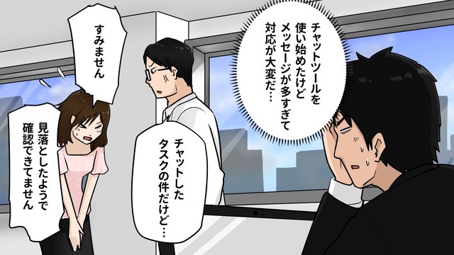このスレッド機能がない場合、以下のようなイメージで複数のトークテーマが入り混じります。そうなると、確認が必要なメッセージの見落としが起きるリスクも増加します。