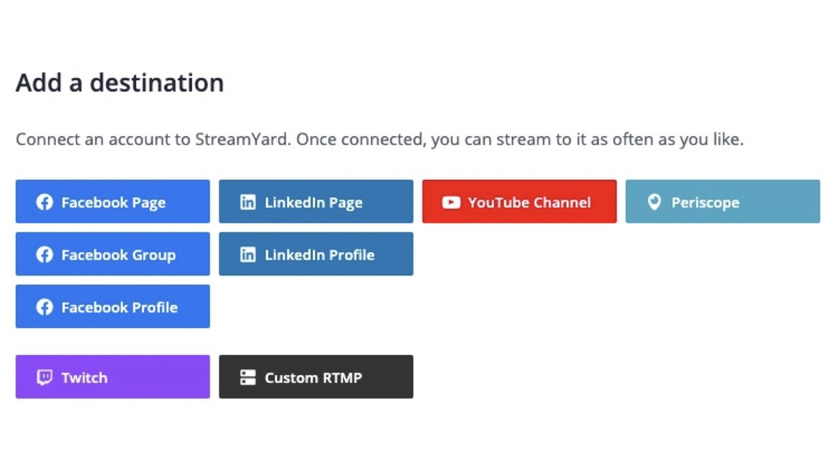 StreamYard はカメラの映像を取り込み、YouTube や Facebook、その他動画配信プラットフォームなど複数のチャネルに同時に配信できるライブプラットフォームです。それぞれのアカウント個別の配信準備をする必要がありません。